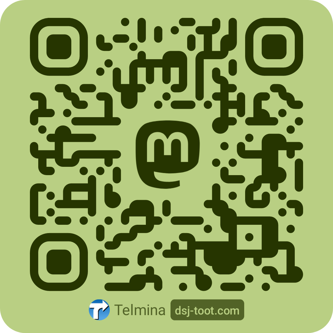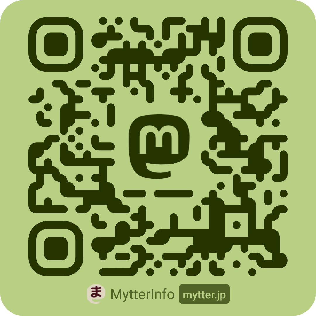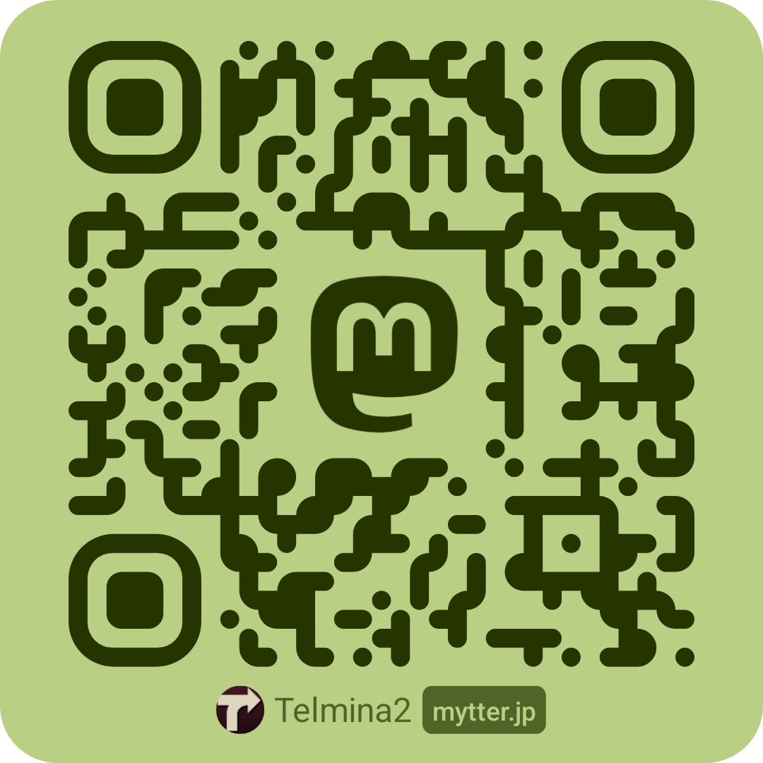 | @Telmina@mastodon.online | QRコード | mastodon.online | 利用頻度は低め。機会は少ないが、英文で発言する場合はこちらを使うことになる。 「mastodon.online」は、Mastodon作者の Eugen Rochko氏自らによる、Mastodonの準旗艦コミュニティ。 |
