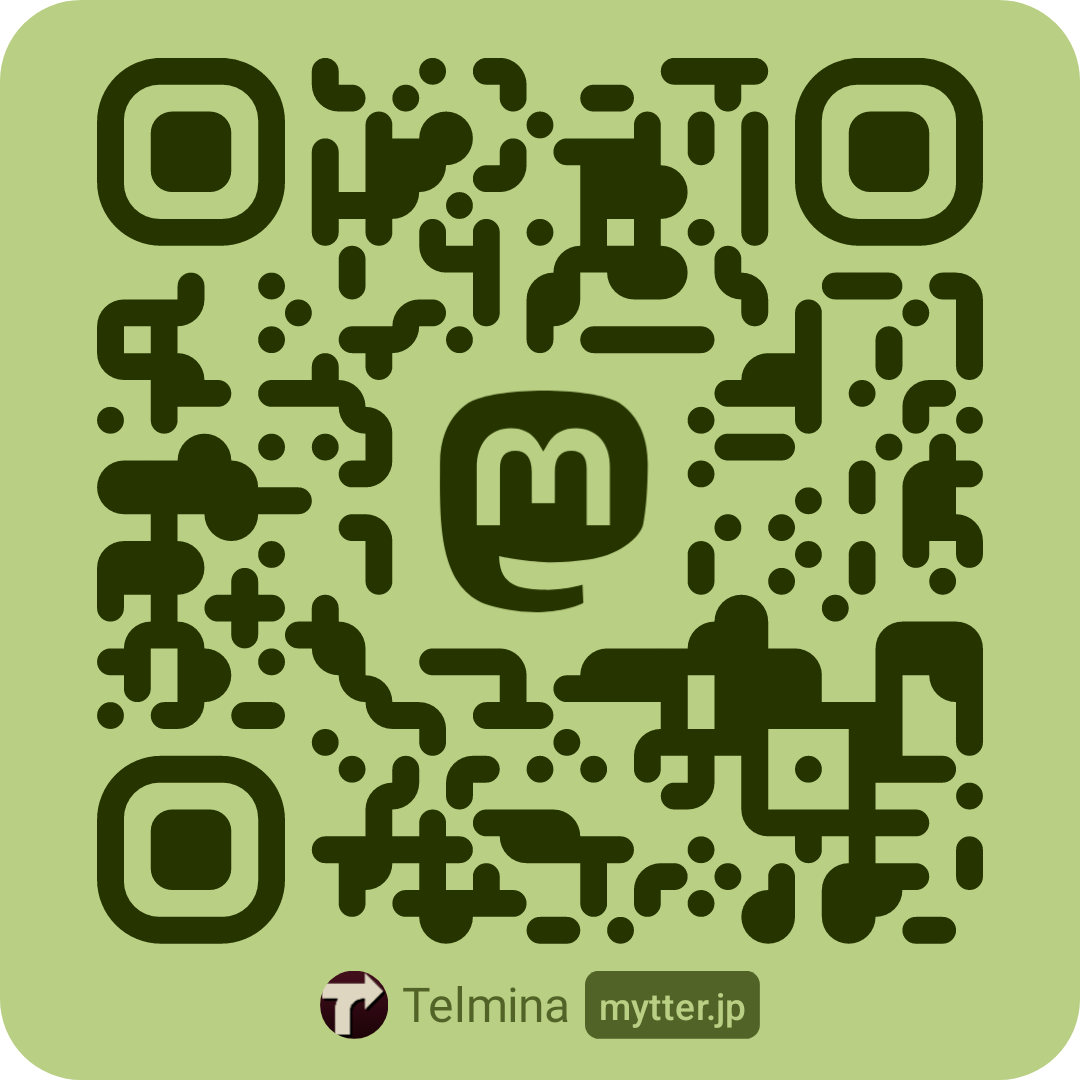| @Telmina@one.telmina.net | QRコード | Telmina One S2 | テルミナ™専用のいわゆるお一人様サーバのアカウント。 Fediverseにおけるテルミナ™のメイン・アカウント。 |