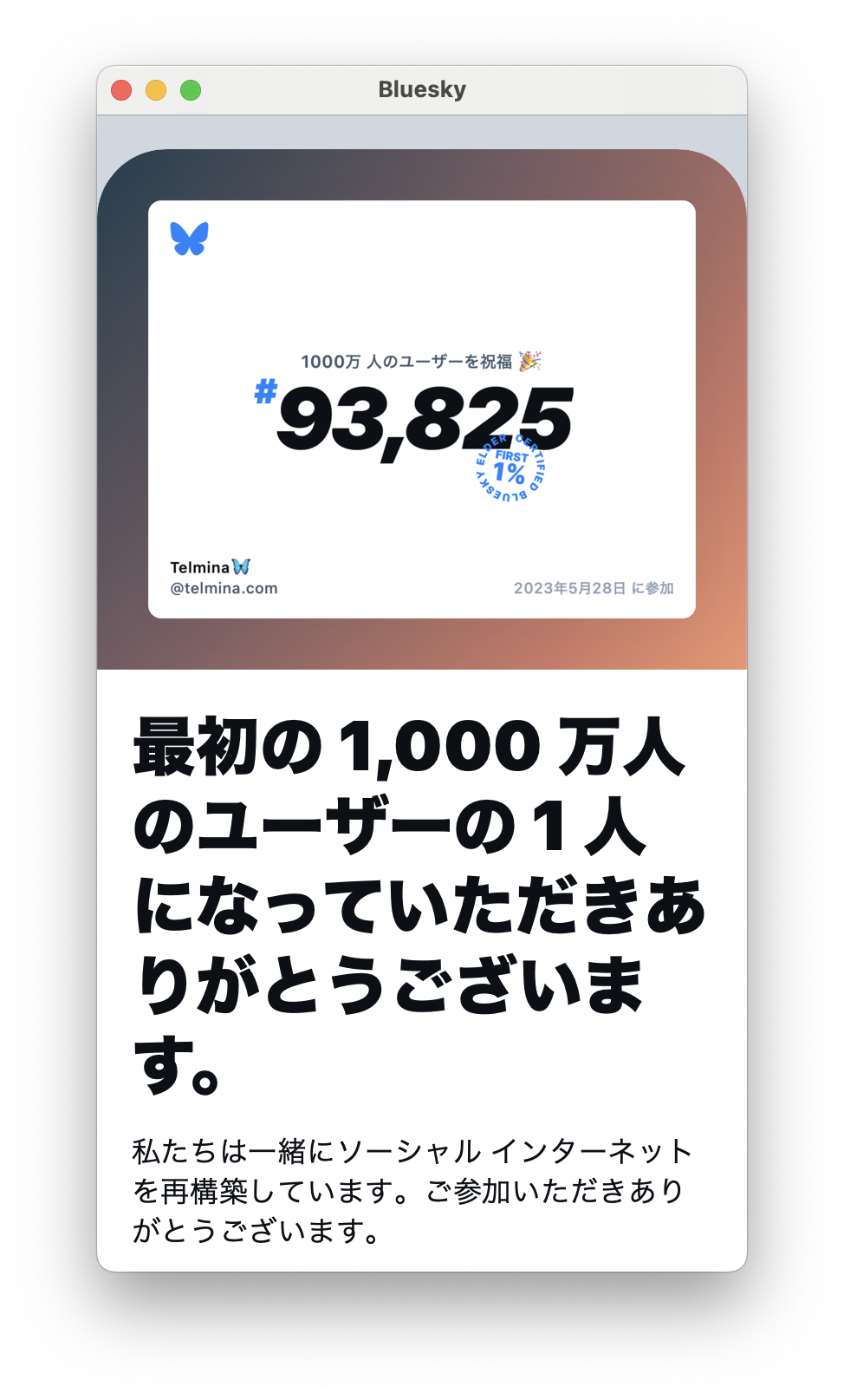 私はあくまでBlueskyのライトユーザーに過ぎません。とはいえ、一応2アカウントとも、初期10万アカウントのうちのひとつには含まれているようです。